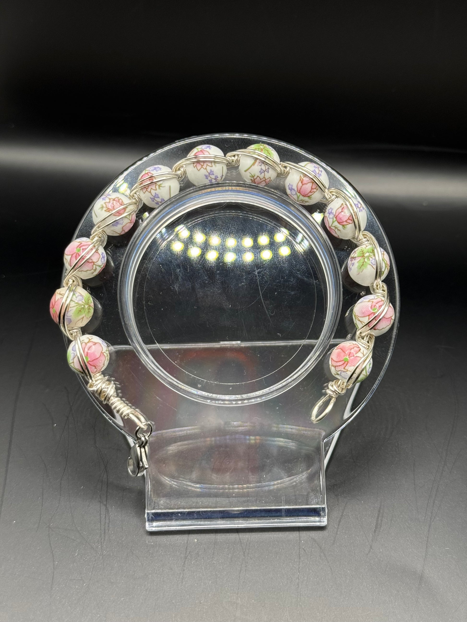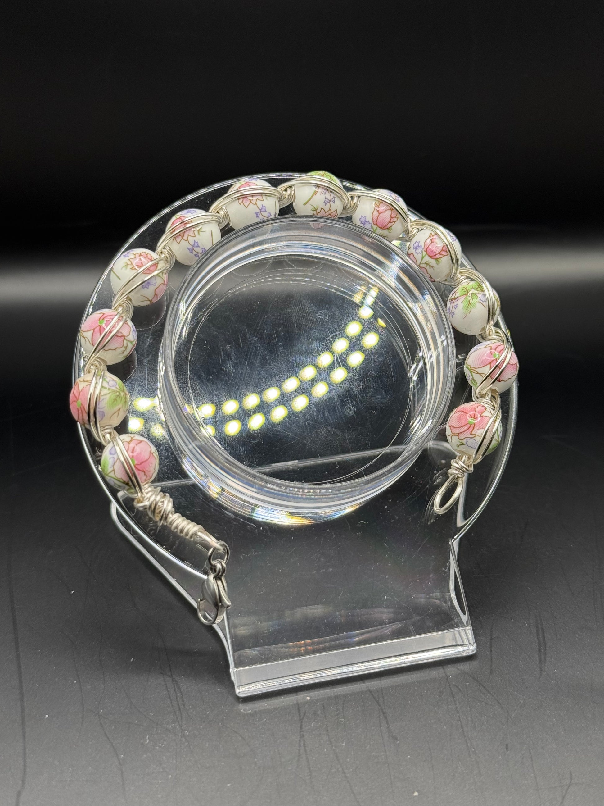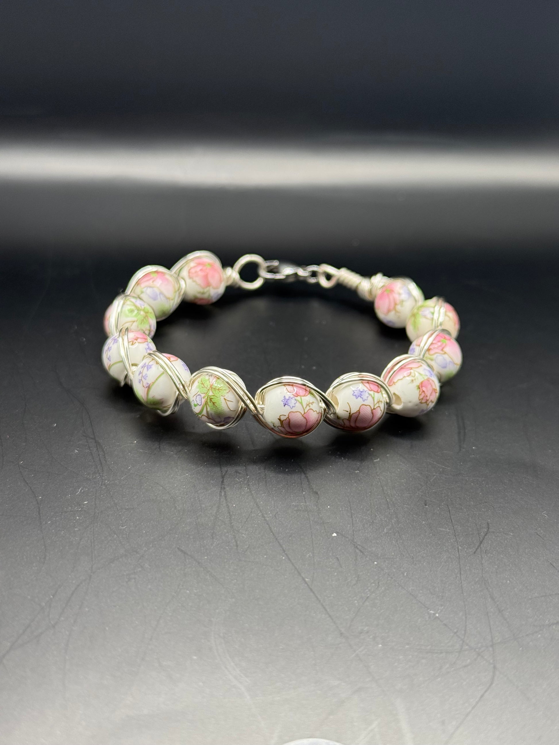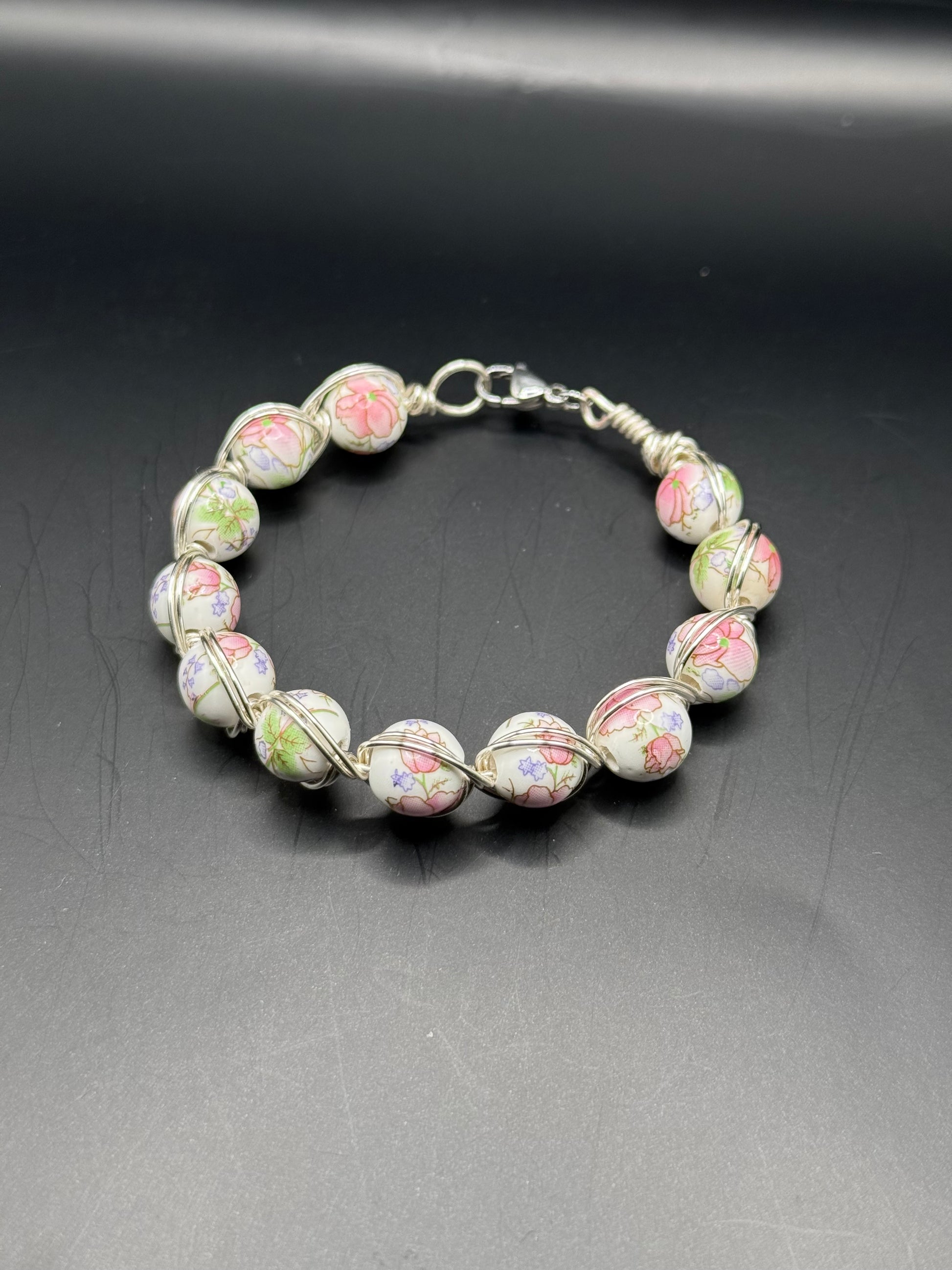 A-floral-Dell is a wire wrapped bracelet with white beads with a floral design. Lobster clasp closure.