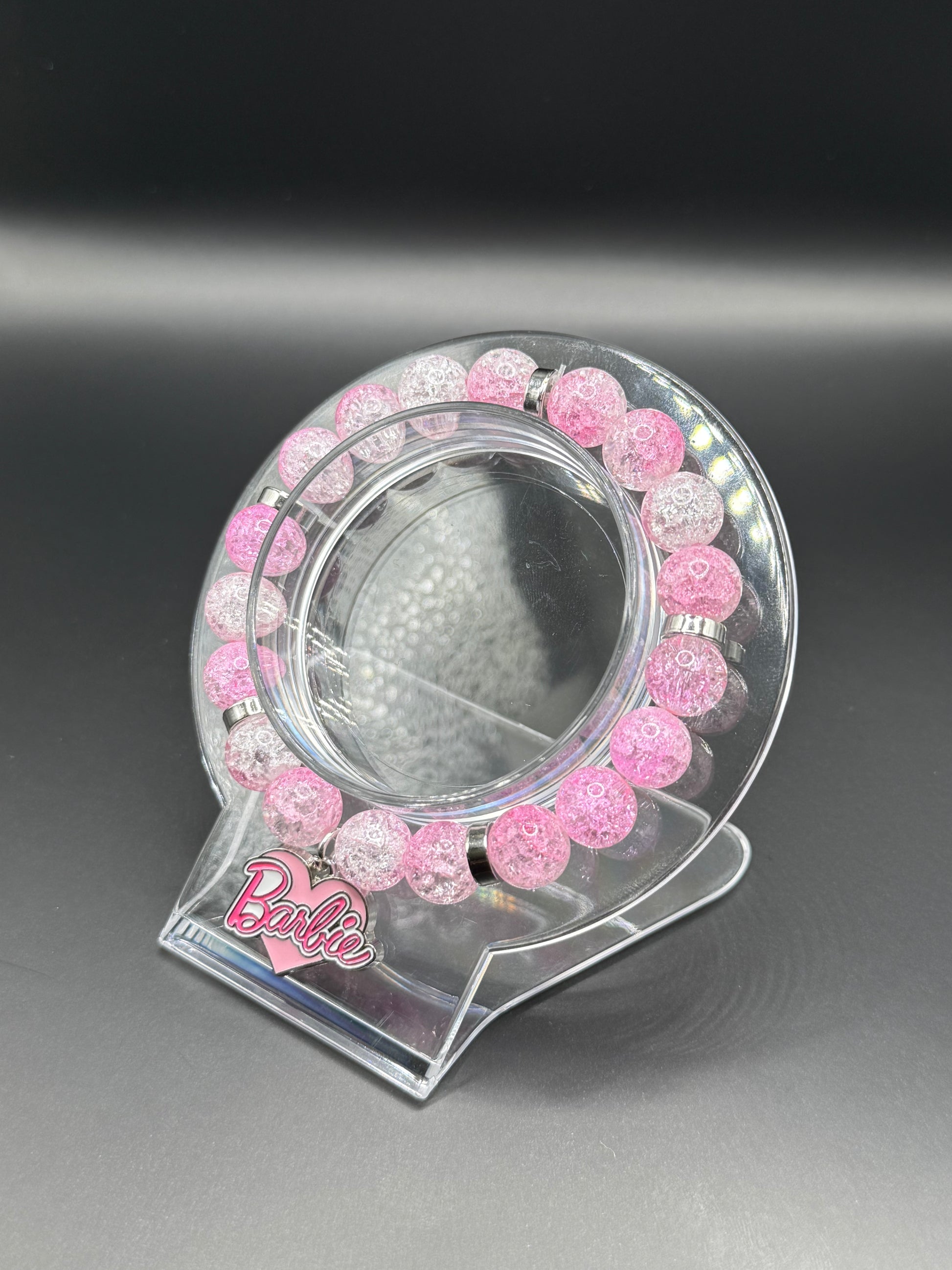 Pink and clear glasses beaded bracelet with a heart barbie charm