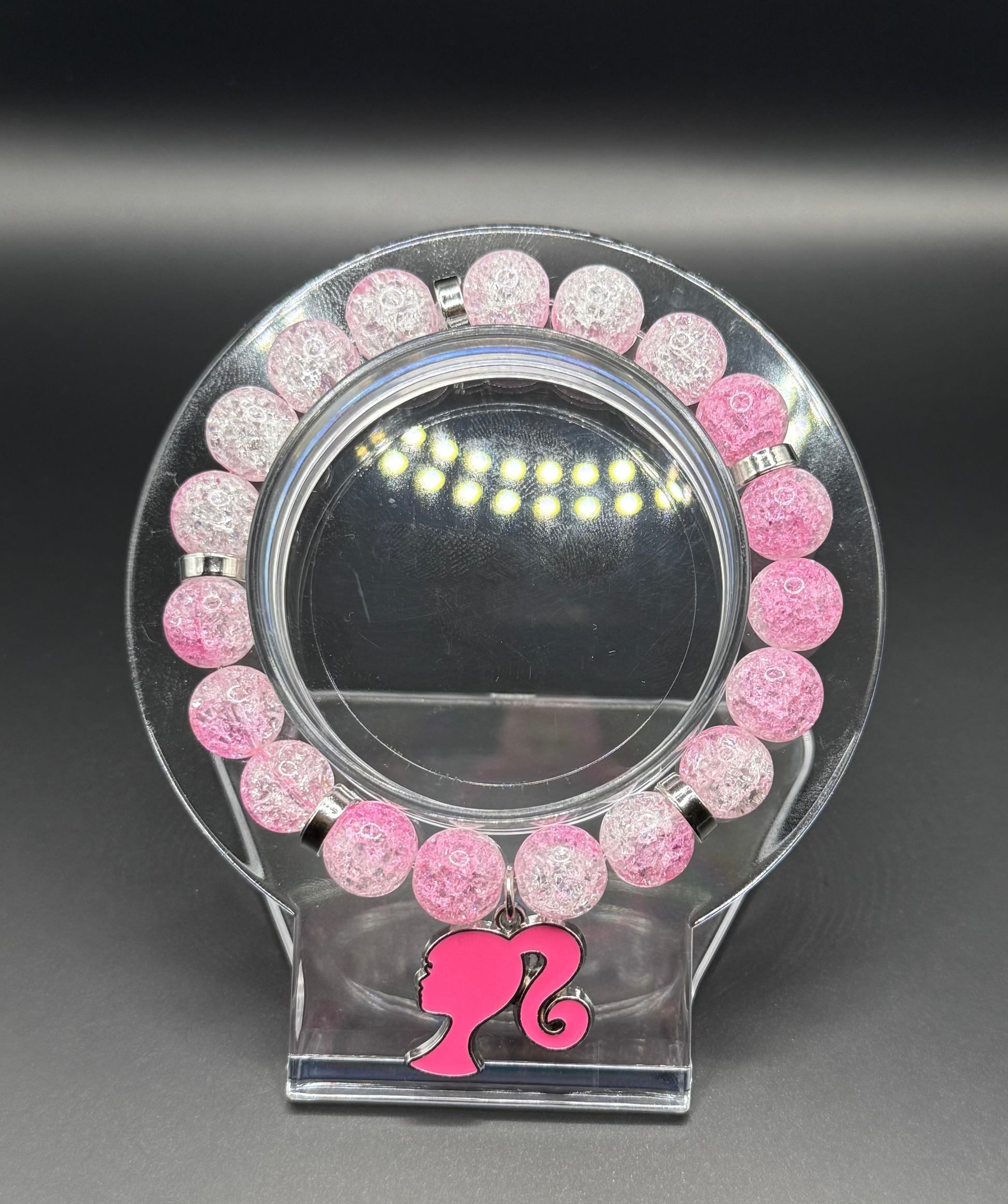 Pink and clear glass beaded bracelet with Barbie's head silhouette charm in pink