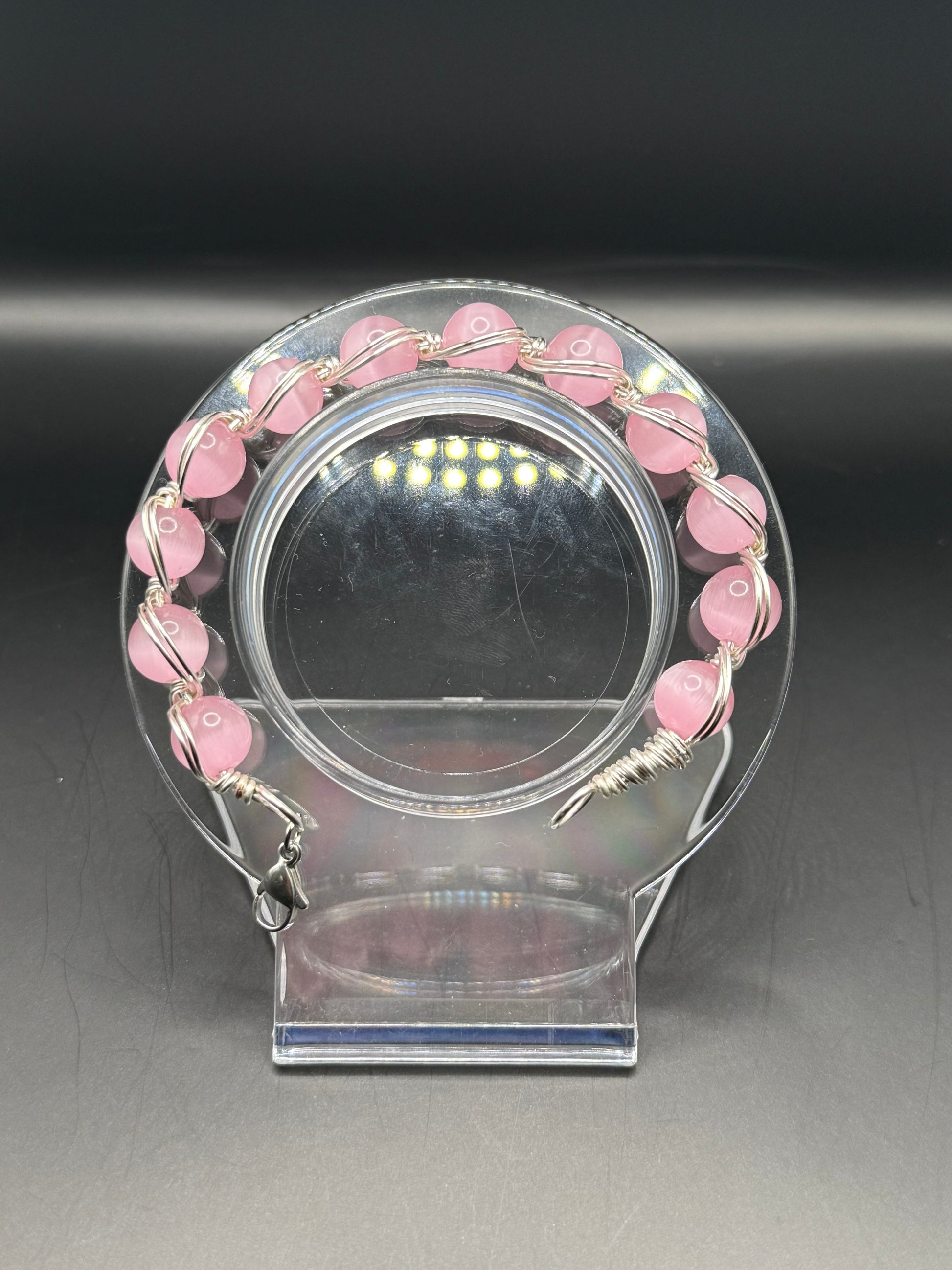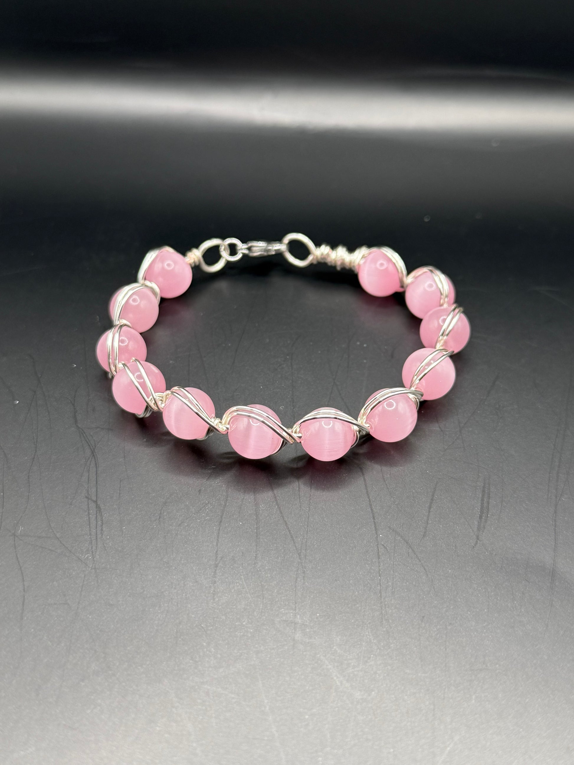 Pink April is a wire wrapped bracelet with pink cat eye beads with a lobster clasp. Bracelet can fit the average wrist size (from 6” to 7”).