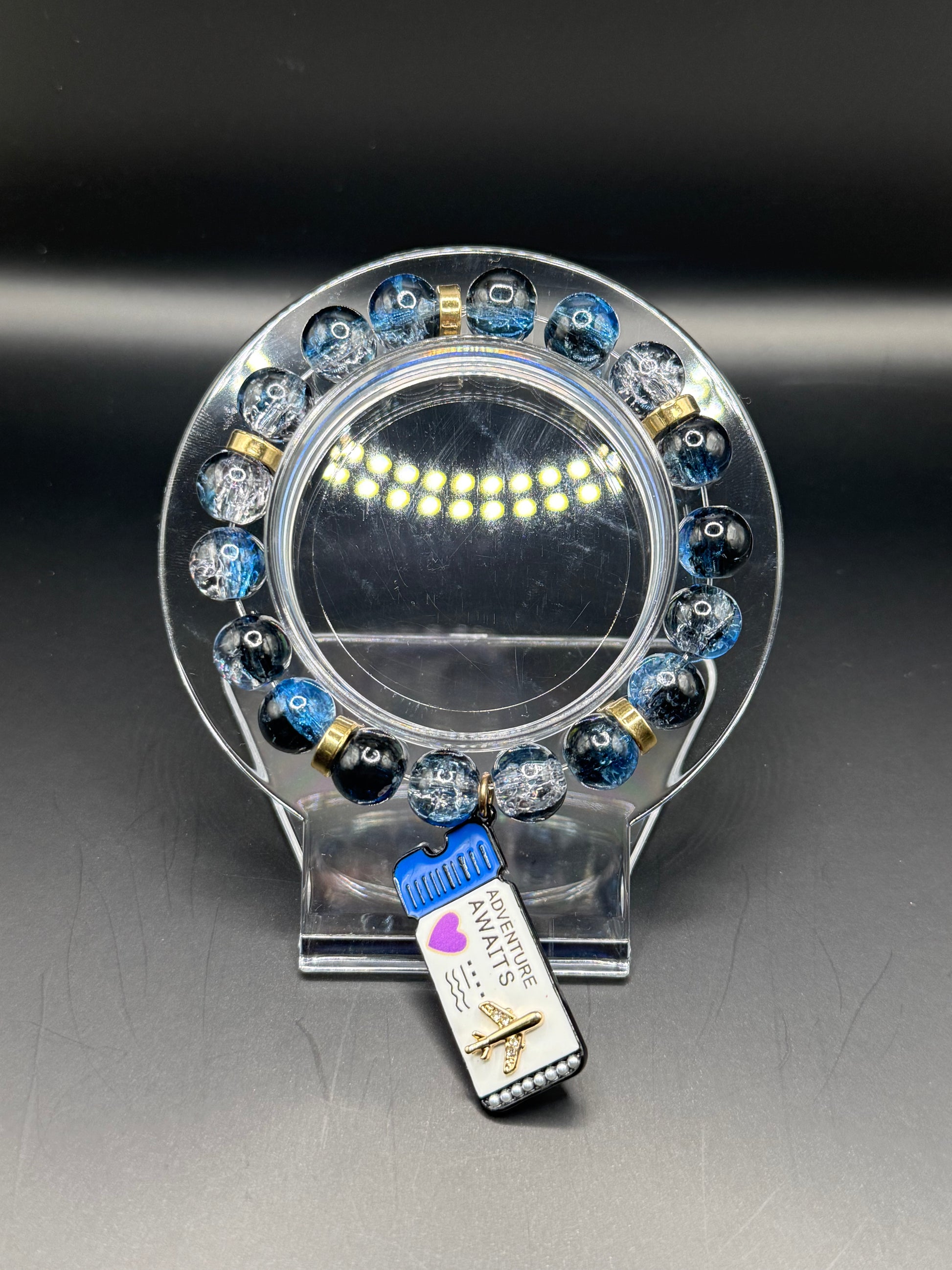Black, blue and clear glass beaded bracelet with gold spacers with a “travel ticket” charm.