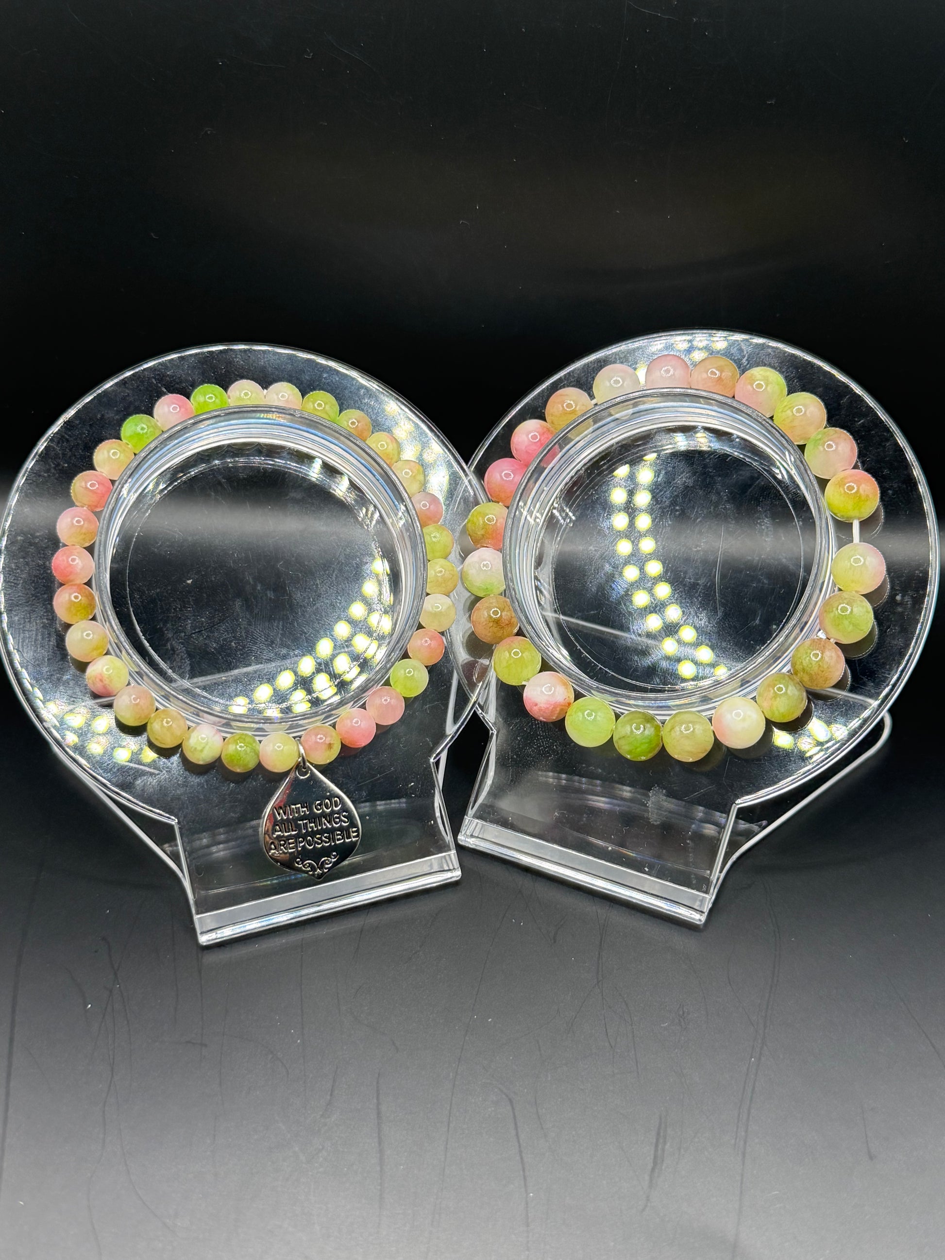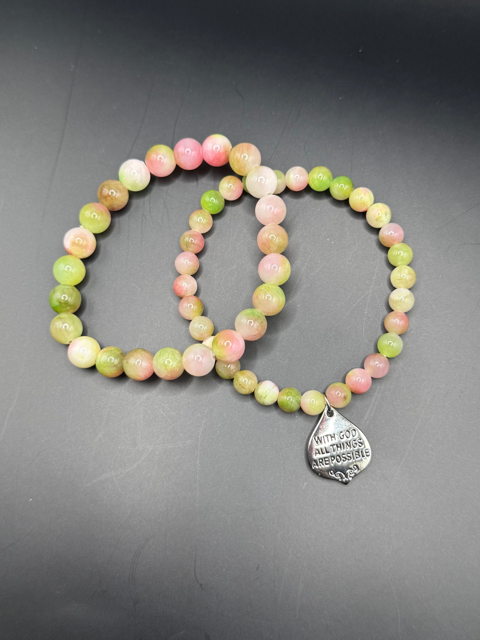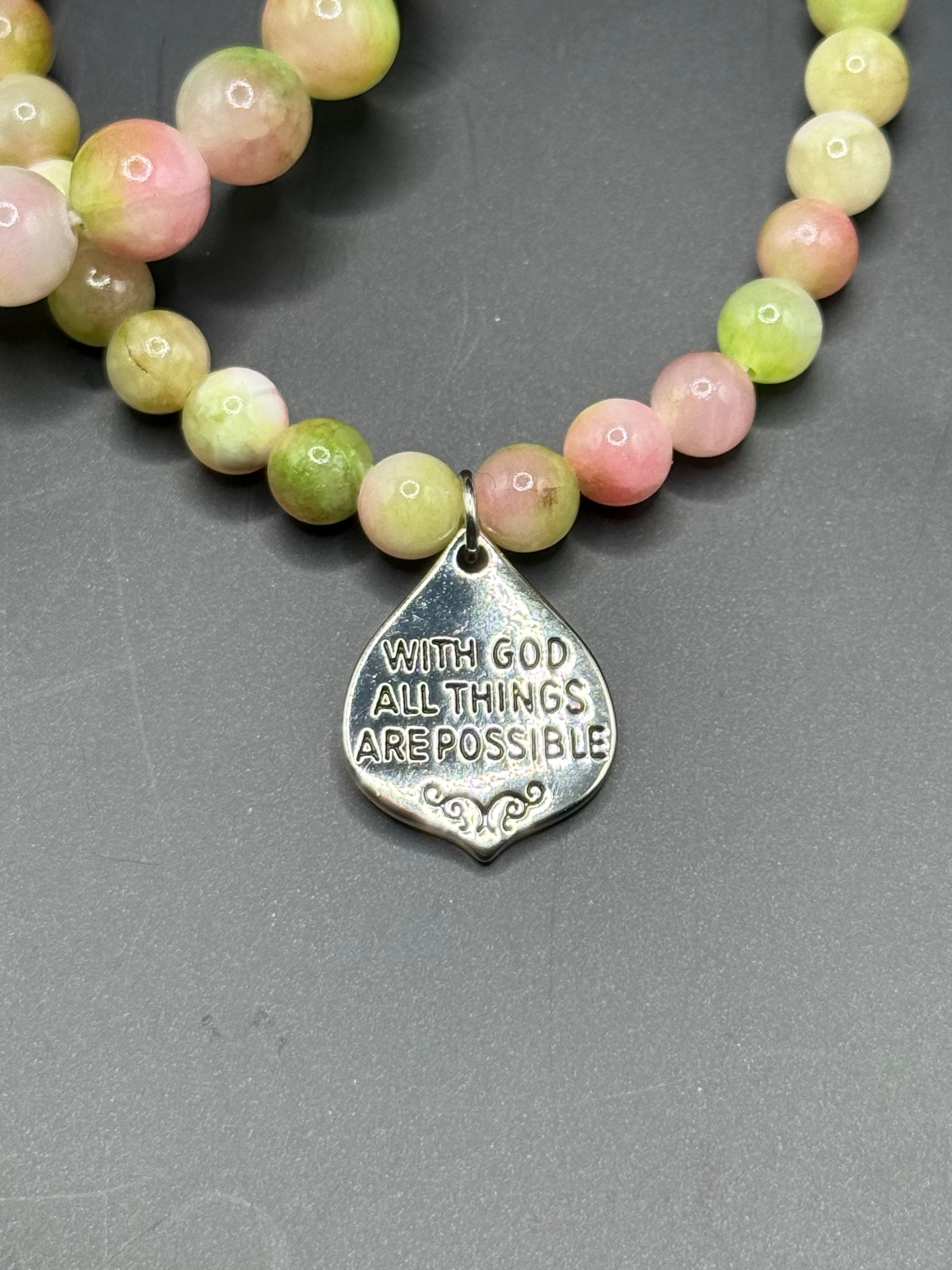 Beautiful green, pink, and with hints of white and browns beaded bracelet set. With God All Things Are Possible