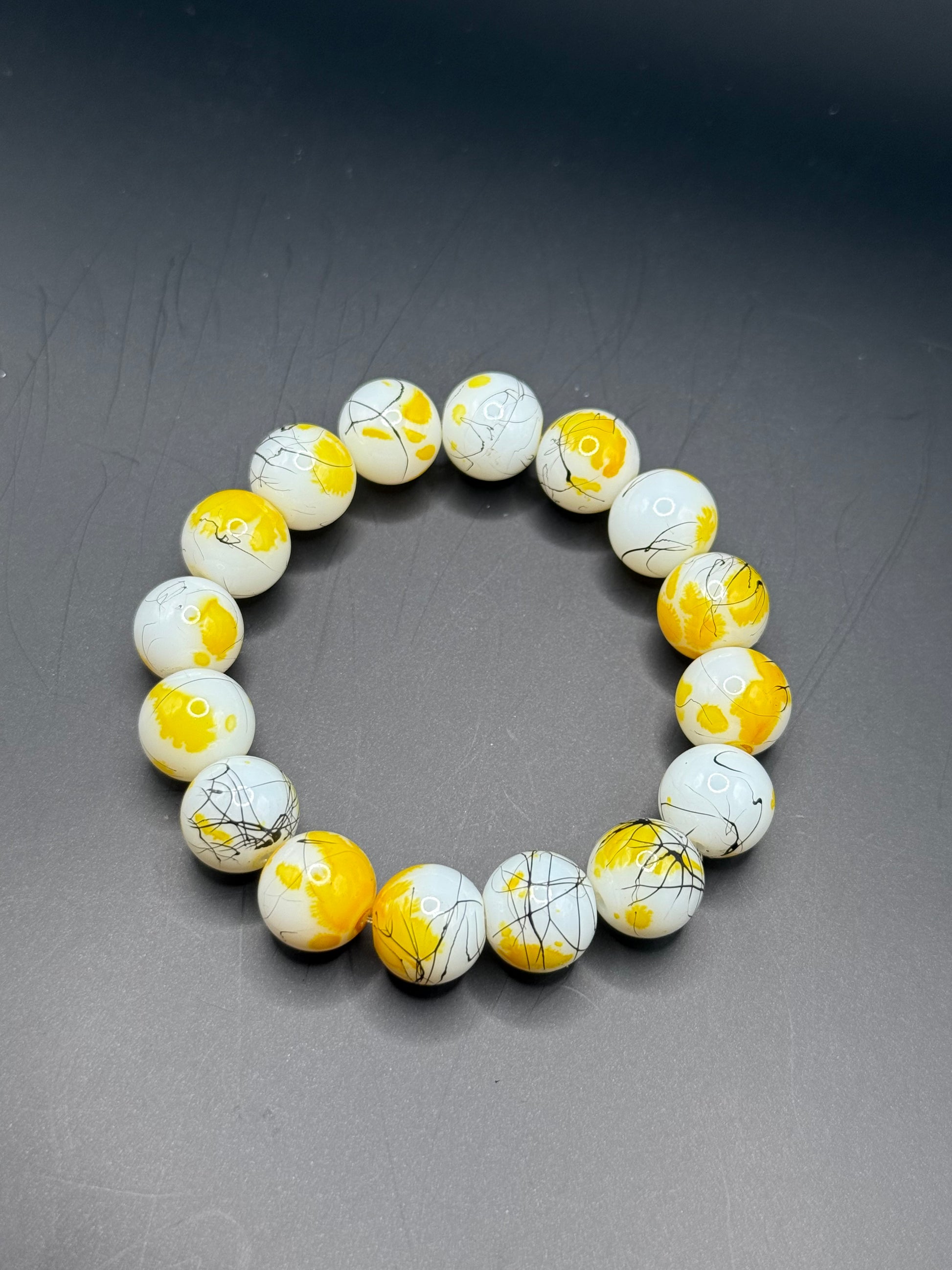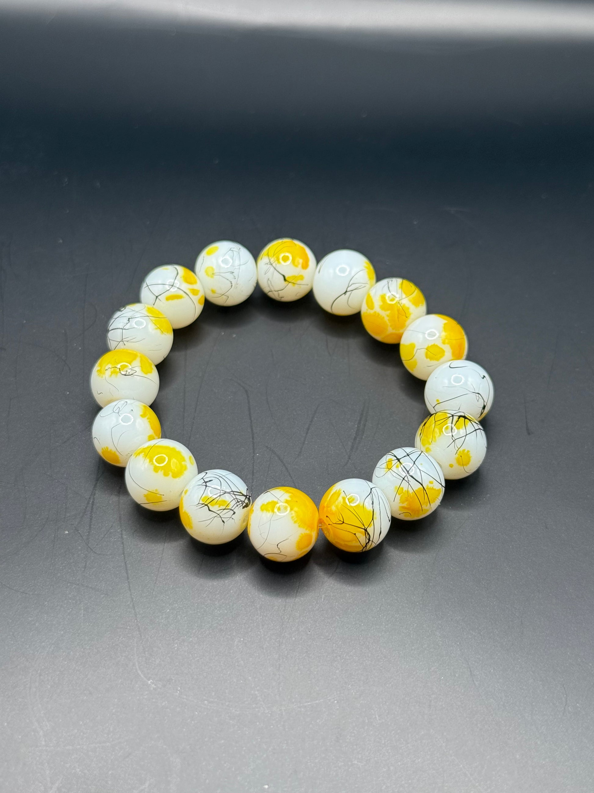 Yellow and white beaded bracelet with little black swirls/lines